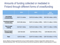 Finland’s Ministry of Finance has published an update on the nascent Finish crowdfunding industry.  According to their report,  Finland’s crowdfunding market more than doubled in size during 2016. The Finish government estimates the total amount raised during 2016 stands at €153 million in contrast to the year prior (€70.5 million) the amount has more than doubled. Two years ago the market stood at €52 million.